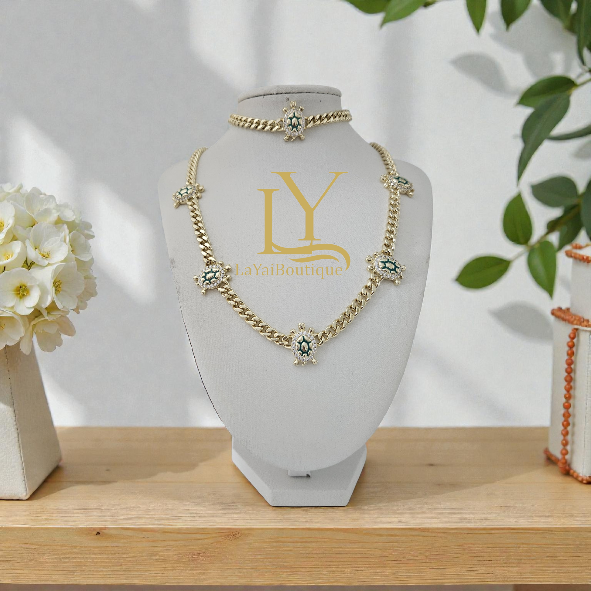 Este exclusivo conjunto está elaborado en oro laminado 14K, con una elegante cadena tipo eslabón decorada con delicados dijes de tortuga, símbolo de protección, estabilidad, sabiduría y buena fortuna. Su diseño combina significado y sofisticación, convirtiéndolo en una pieza atemporal y llena de intención.
